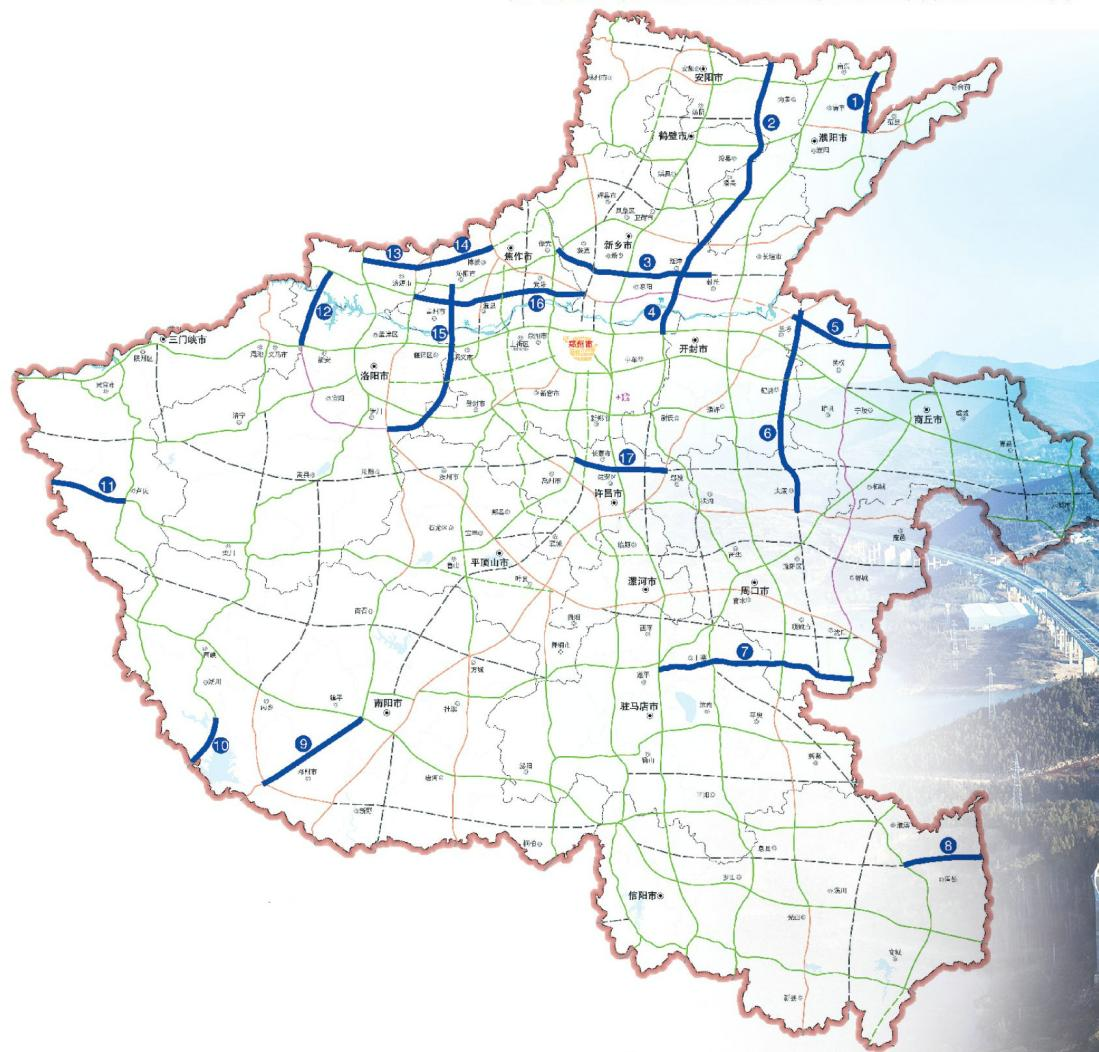 15.沁陽至伊川高速。全長99.0公里、總投資188.7億元,位于焦作、鄭州、洛陽市境內(nèi),分別長25.2公里、14.8公里、59公里。